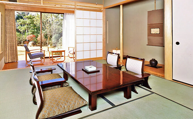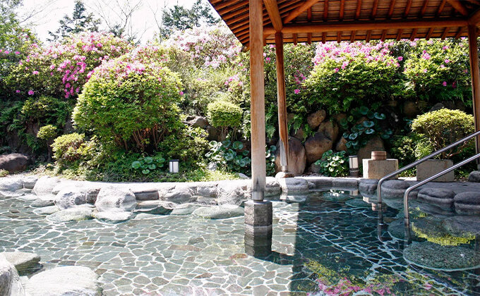『伊豆畑毛温泉 大仙家』は、木立に囲まれた開放感あふれる露天風呂と、伊豆石を敷き詰めた風情ある大浴場が魅力の温泉宿です。