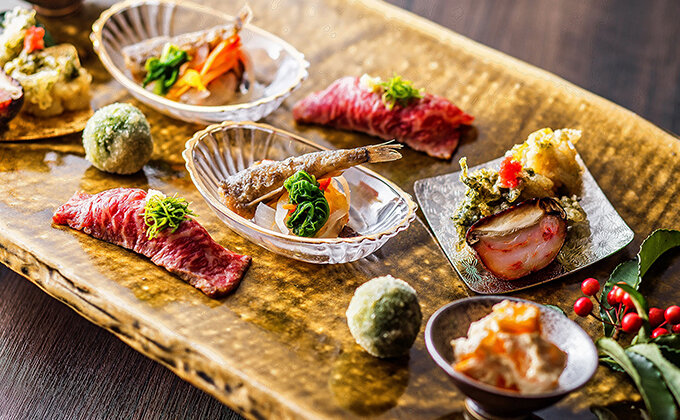 食事は、料理長が自ら足を運んで選んだ伊豆の厳選食材をふんだんに使用した、伊豆ならではのコースを堪能できます。