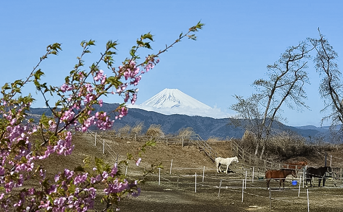 与那国馬は、小柄で人に慣れやすい性格なので、初めて馬を見る方や小さなお子様でも安心して触れ合うことができます。富士山や相模灘などを眺めながらの乗馬体験はここでしか味わえません。